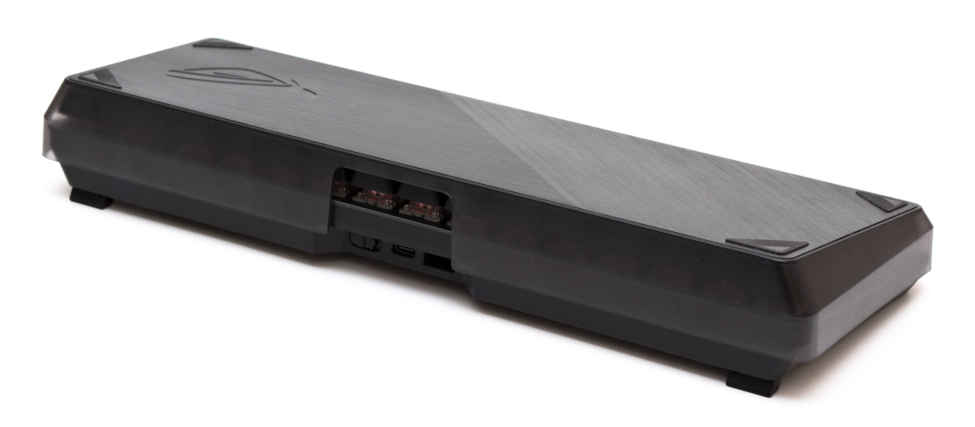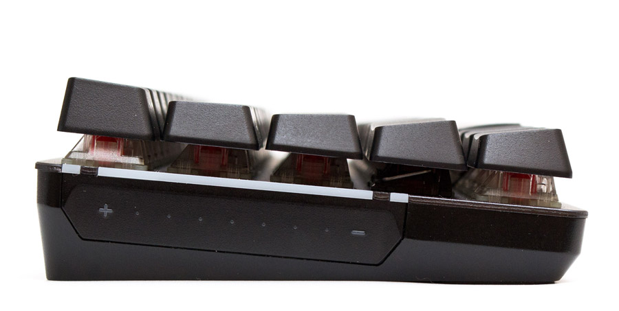 Изюминкой ASUS ROG Falchion является сенсорная панель, встроенная в левую боковину корпуса. Она очень чувствительная. На ней есть тактильные насечки в виде символов «+» и «–» и семи точек, каждая из которых подсвечивается разным цветом, в зависимости от текущей индикации или характера прикосновения пользователя. Например, при изменении уровня громкости вслед за пальцем бегает белая полоска света, при одиночном нажатии в одну из трех зон вверх, внизу или посередине воспроизводится красный цвет, а альтернативно светодиоды могут отображать текущий уровень заряда батареи или синхронизироваться с подсветкой клавиш. Красота, да и только. Светодиодная полоса на грани вверху дублирует подсветку боковой панели. В её верхней части находится индикатор блокировки Win Lock, а в нижней части — Caps Lock, оба белого цвета.