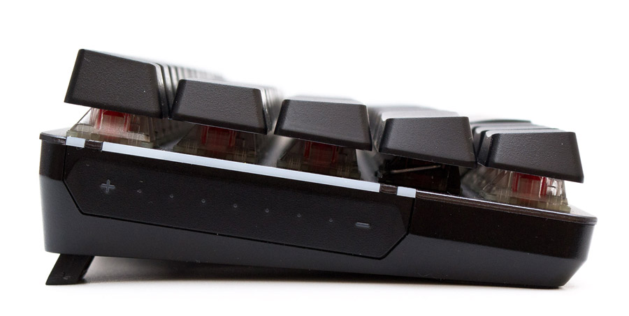Минимальная высота клавиатуры в профиль по заднему ряду клавиш со сложенными ножками составляет 39 мм. При разложенных ножках высота возрастает до 44 мм. Кнопки в профиль лишены эргономичного наклона и расположены ровными уступами друг за другом. Кстати, хотя пластиковые боковины и наклонены внутрь, браться за них при перестановке клавиатуры придется не в самом очевидном месте, чтобы случайно не активировать сенсорную панель слева.
