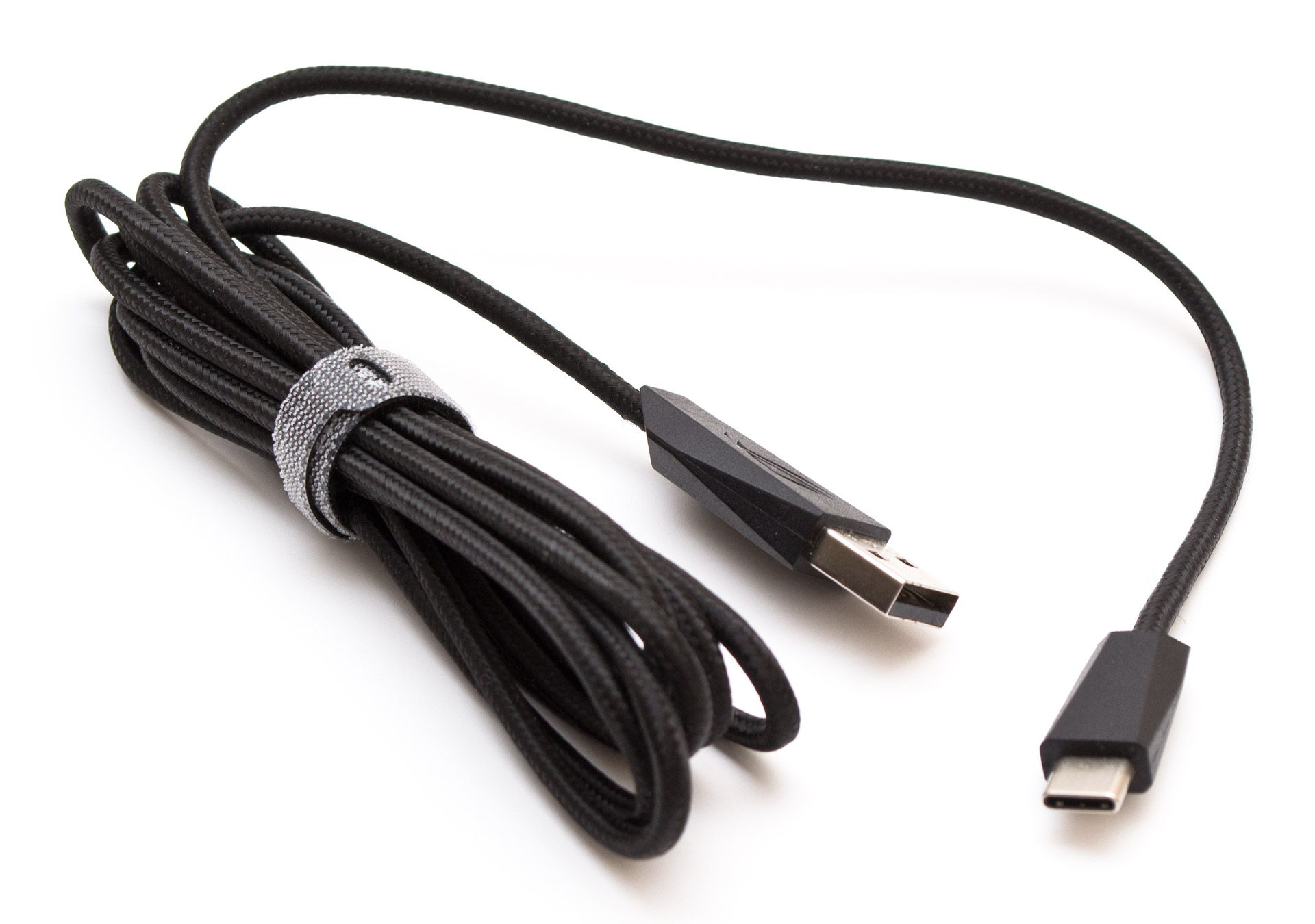 Кабель в оплетке имеет длину 1,9 метра, разъем USB Type-C с одной стороны и USB Type-А с другой. Он тонкий, достаточно гибкий, хотя и не особо мягкий. Защит от перегиба нет, зато есть липучая лента для регулировки длины, или чтобы складывать его при переноске.