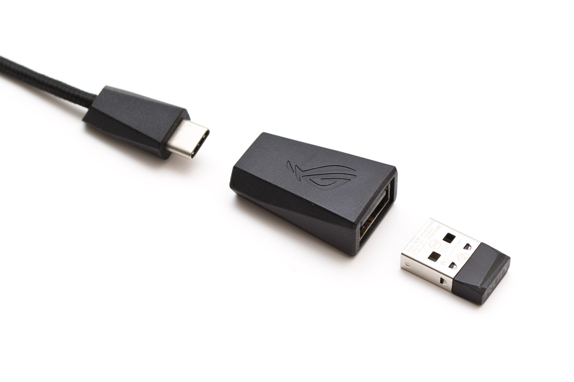 Отдельно в комплекте есть и переходник, позволяющий подключить в кабель приемник. Это нужно для того, чтобы уменьшить задержки беспроводной связи, располагая его максимально близко к клавиатуре. А после снятия переходника, под рукой сразу окажется шнур для зарядки. К слову, устройство отлично работает и по кабелю во время заряжания.