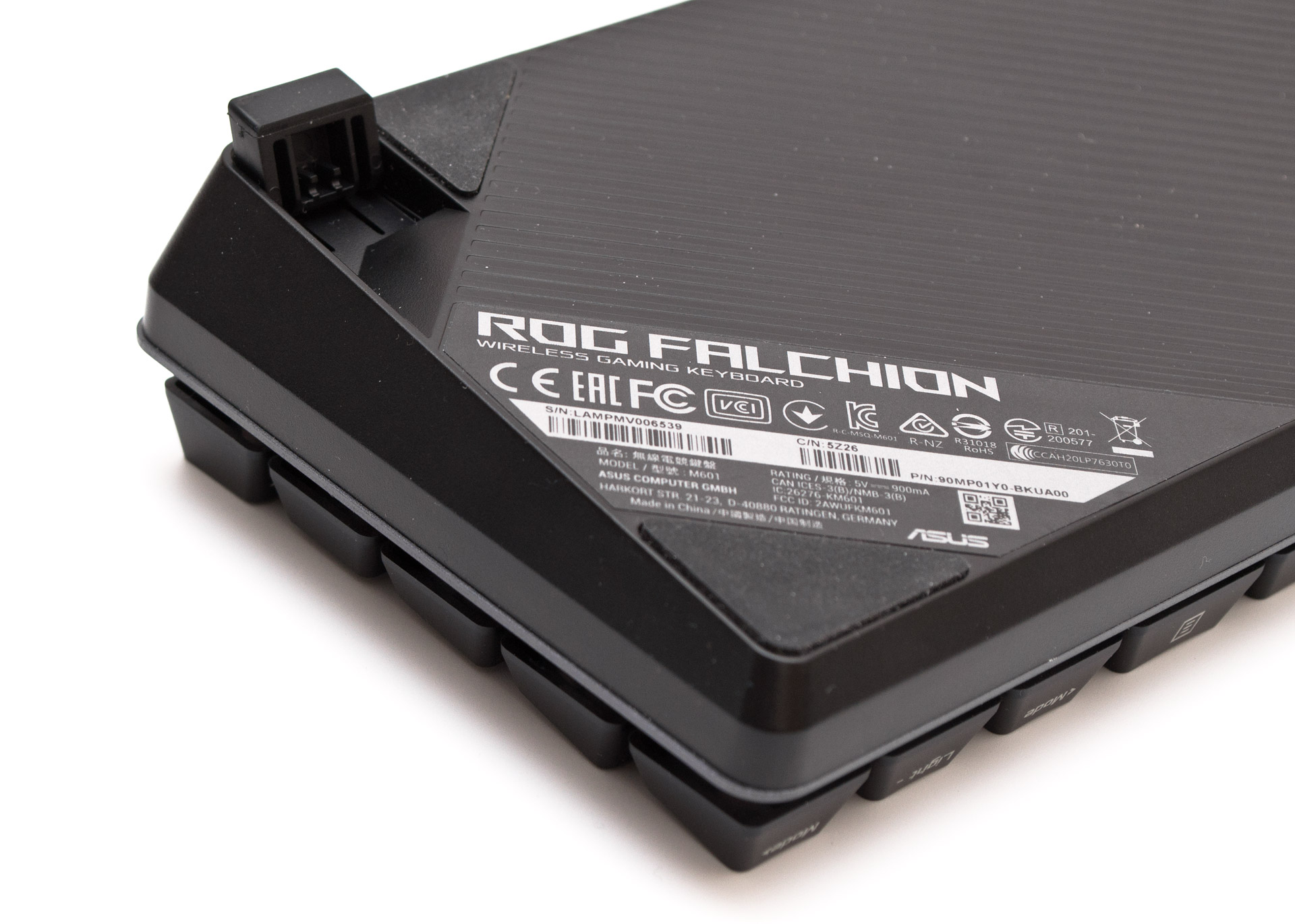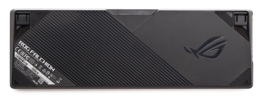 Нижняя панель имеет фигурный рисунок в виде логотипа ROG и диагональных линий. Четыре резиновых треугольных ножки наклеено по углам. Они сделаны из фирменной «зеркальной» резины, которая, при условии регулярной очистки от пыли, намертво «приклеивает» клавиатуру к поверхности стола. Наклейка с серийным номером расположена в правом нижнем углу.