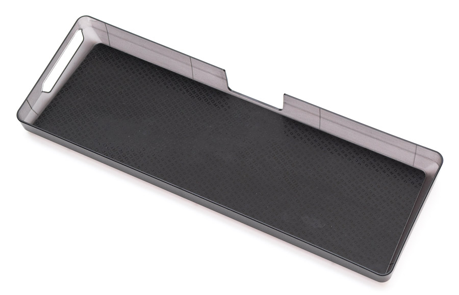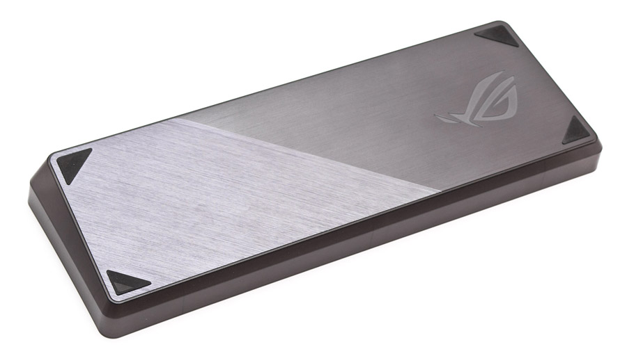 Необычный аксессуар, который идет в комплекте с ASUS ROG Falchion, — это защитная накладка из поликарбоната. Ею можно накрывать клавиатуру при переноске или длительном простое без работы, чтобы закрыть колпачки от пыли и повреждений. Внутренняя сторона лотка прорезинена. Внешняя сторона по богатому выполнена из металла с логотипом ROG и шлифованными диагональными линиями. По углам на неё наклеены резиновые ножки, такие же, как и на самой клавиатуре.
