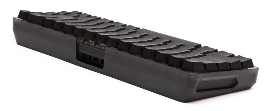 Клавиатура ASUS ROG Falchion тестировалось преимущественно в беспроводном режиме, поскольку именно этот вариант работы является для нее основным. Приемник располагался на дистанции в 50 см, в зоне прямой видимости. Перед началом активного использования устройство несколько дней была подключено по проводу, чтобы убедиться, что батарея будет заряжена полностью. Но сначала несколько слов о конструкции в целом. Клавиатура отлично выдерживает тест на диагональное скручивание, не прогибается и не скрипит при использовании. Это свидетельствует об отличной подгонке пластиковых и металлических деталей. Ощущается ROG Falchion тяжелее своего реального веса, с оглядкой на уменьшенный размер. Ощущение усиливается и за счет очень цепких ножек, не дающих ей скользить. Негативный момент состоит в том, что при попытке передвинуть клавиатуру пользователь обычно берется за нее по бокам. И тогда непроизвольно срабатывает сенсорная панель слева, ведь она занимает большую её часть. К счастью, сенсор можно отключить при желании. Общая высота подобрана удачно и позволяет обходиться без ладонной подставки, хотя для длительного времяпрепровождения её все же лучше будет приобрести дополнительно. Практического смысла в накладном поликарбонатном чехле немного, как по мне, но его наличие в комплекте очередной раз подчеркивает высокий статус продукта.