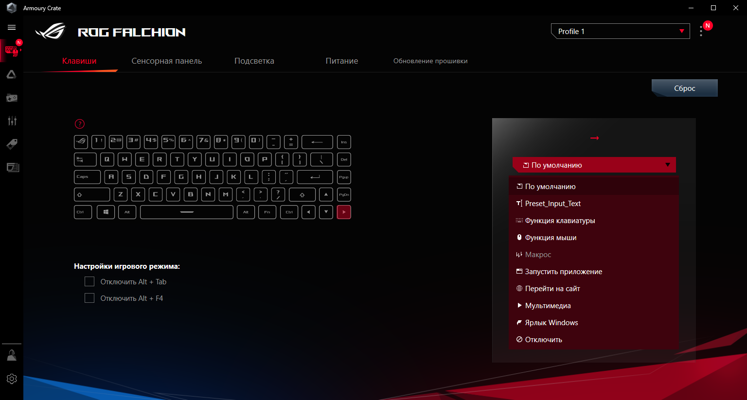 В качестве программного обеспечения клавиатура ASUS ROG Falchion использует тяжеловесный универсальный «комбайн» Armoury Crate, который требует загрузки с официального сайта и установки. Мы рассмотрим лишь те вкладки, что касаются клавиатуры непосредственно. Первый экран приложения называется "клавиши". Здесь можно их переназначать. Для этого доступны все кнопки кроме Fn. Назначать можно текстовые сообщения, команды клавиатуры и мыши, макросы, запуск определенного сайта или приложения, восемь мультимедийных команд, шесть основных команд оболочки Windows. Еще клавишу можно вернуть на значения по умолчанию или отключить полностью. Помимо кнопки Win можно настроить отключение сочетаний Alt+Tab и Alt+F4 в игровом режиме.
