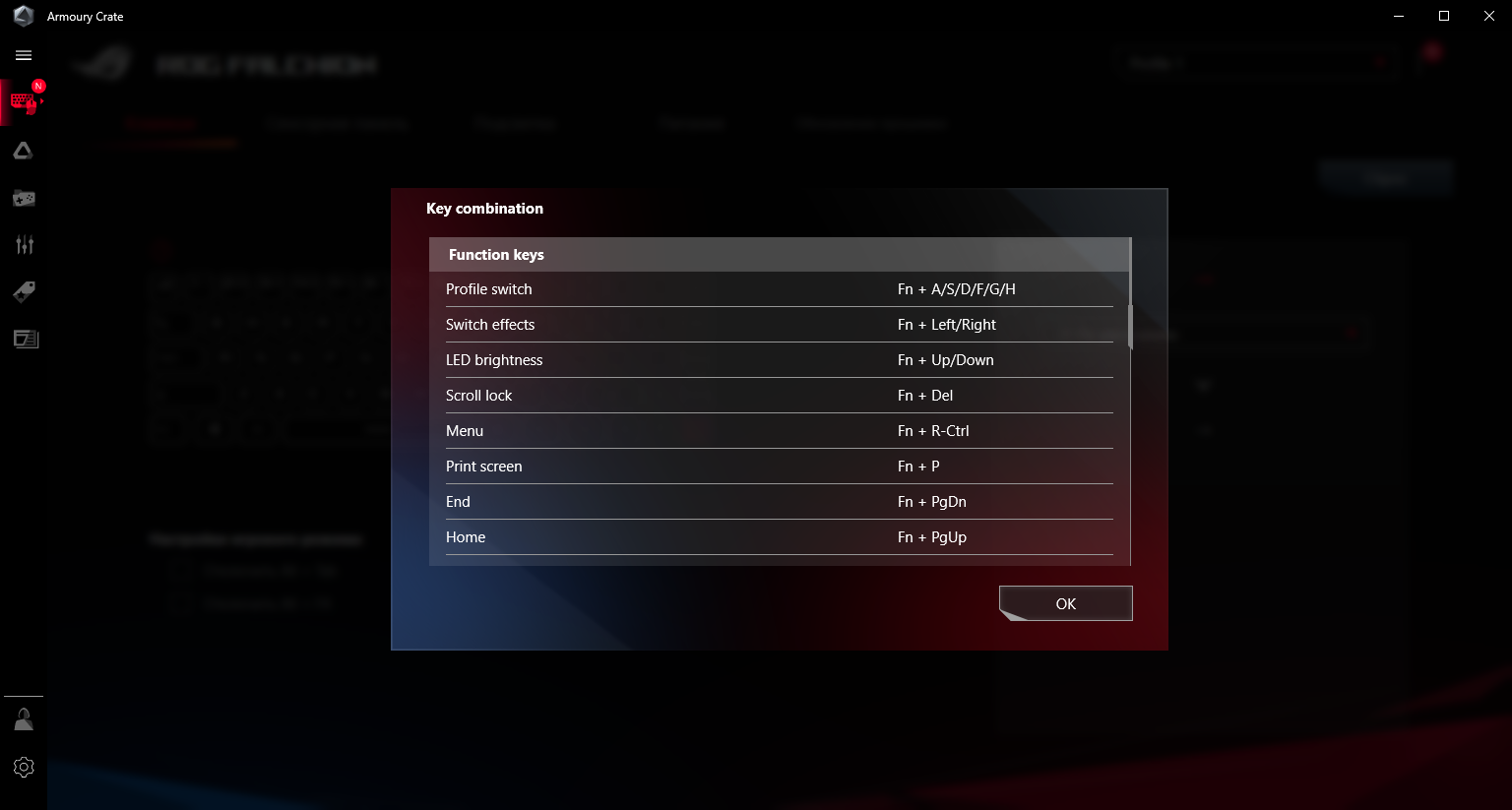 Для укороченной клавиатуры многие базовые функции доступны лишь через сочетания с клавишей Fn. Ниже приведен перечень всех команд, которые у нас получилось воспроизвести на ASUS ROG Falchion.