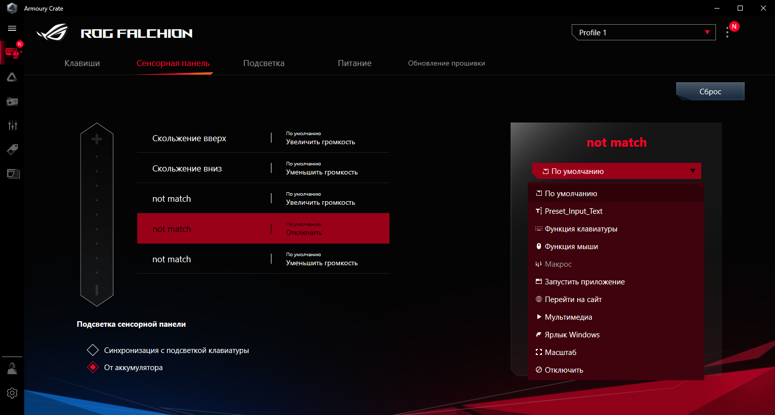 В настройках сенсорной панели можно присвоить пять команд действиям в виде скольжения вверх или вниз (по умолчанию изменяют уровень громкости) или трем зонам прикосновения. Доступный перечень команд тот же, что и для кнопок клавиатуры, не считая «масштаба». Подсветку сенсорной панели можно синхронизировать с другими клавишами или настроить на отображение текущего уровня заряда аккумулятора.