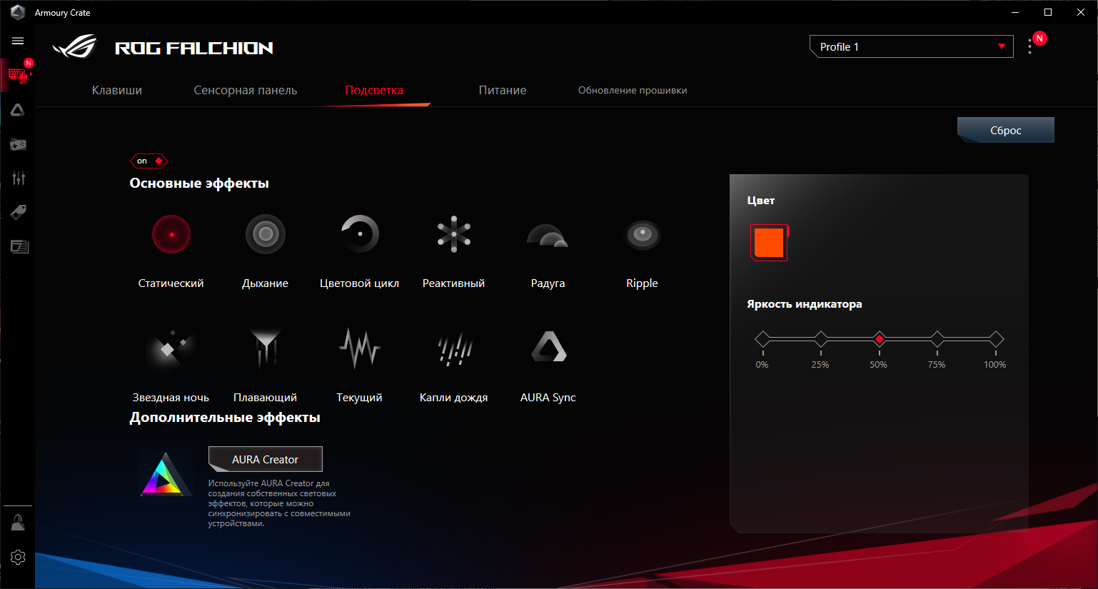 В настройках подсветки доступно 11 вариантов световых эффектов включительно со статичным свечением. Нет только индивидуальной настройки подсветки каждой клавиши — для неё придется загружать в Microsoft Store программу Aura Creator.