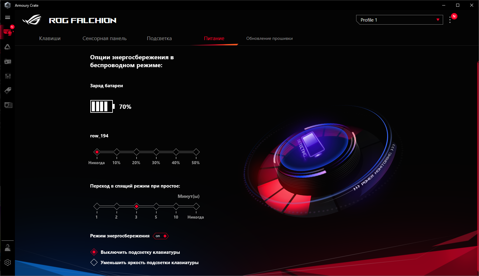 Теперь коротко о настройках энергосбережения. В клавиатуре установлен аккумулятор емкостью в 4000 мАч. Для него заявлено до 450 часов постоянной работы без подсветки и 53 часа с включенной на полную мощность подсветкой. Устройство погружается с сон через 3 минуты простоя без действия (настройка по умолчанию) и мгновенно «просыпается» при нажатии на любую клавишу, которое к тому же регистрируется в системе. За неделю использования по 3–4 часа в день мне удалось понизить уровень заряда лишь до 60% (если верить ПО и индикации на самом устройстве.) Исходя из этого, можно согласиться с заявленными производителем показателями автономности, причем это время именно непрерывной работы, куда не учитывается простой. Единственный минус — почти при каждой активации клавиатуры драйвер выдавал сообщение о том, что она полностью разряжена, хотя по факту она работала без проблем. Вполне возможно, что это программная недоработка. А вот заряжается встроенный аккумулятор действительно долго. В среднем, из полностью «сухого» состояния процесс может занять более восьми часов, хотя многое зависит еще от качества питания USB-порта. В общем, с автономностью у ROG Falchion все хорошо. Без подсветки она может продержаться в интенсивной беспроводной работе почти два месяца. Или до двух недель с подсветкой.