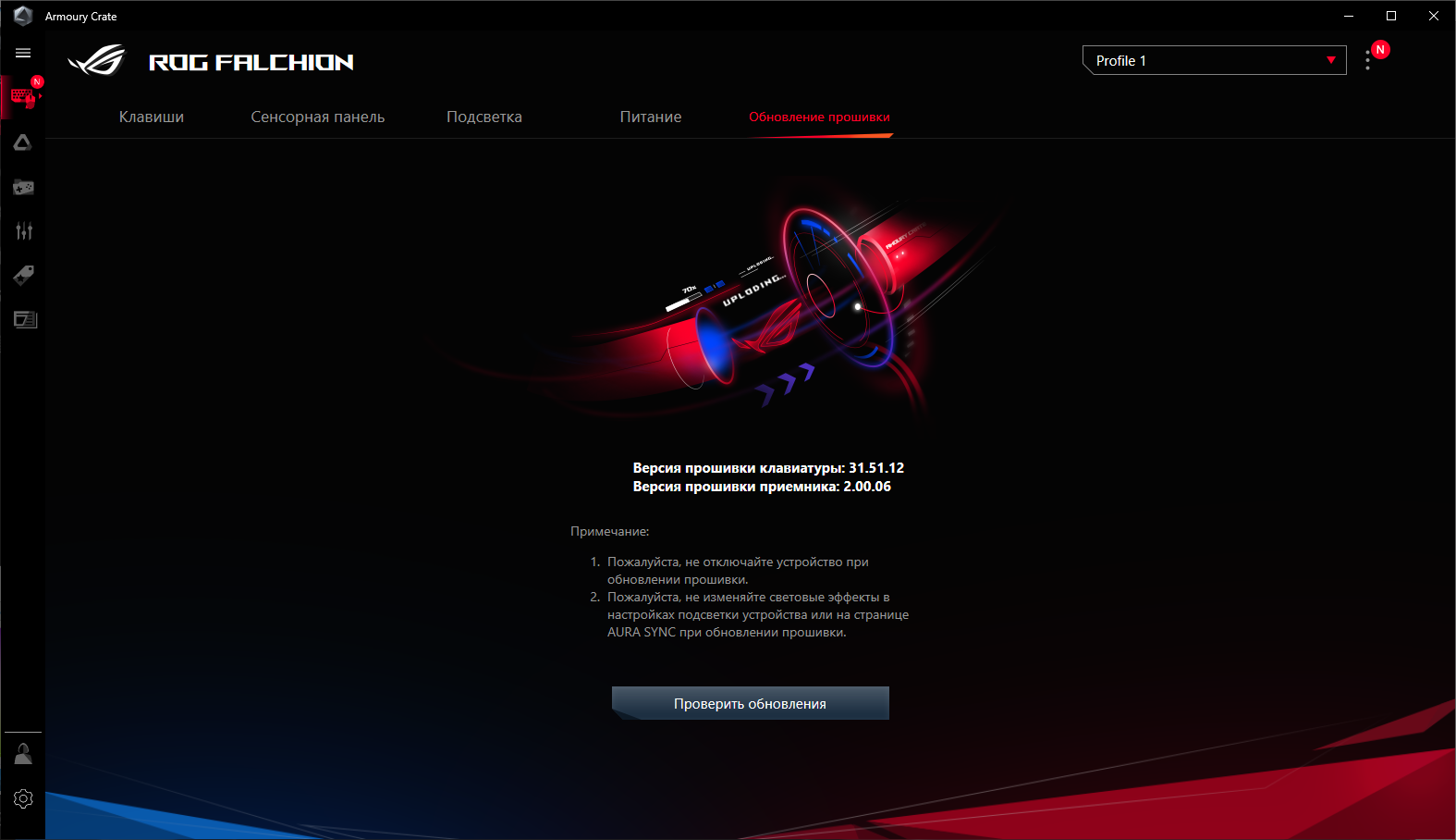 В разделе «обновление прошивки» происходит проверка текущей версии прошивки клавиатуры и приемника, и ее обновление по мере необходимости.