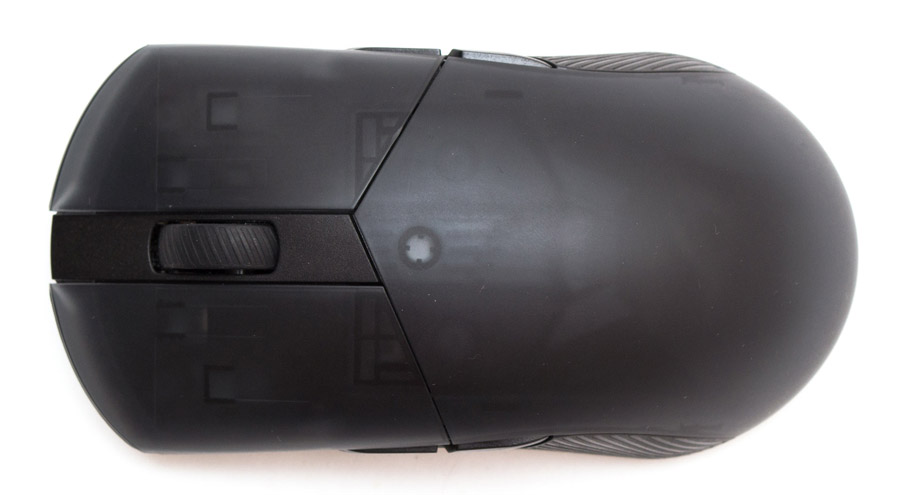 Практически, кроме названия у ASUS ROG Pugio II очень мало общего со своей первой версией. Наиболее заметно это в форме корпуса. Он стал более классическим и обтекаемым, вернулся к истокам в лице симметрии Microsoft 1.1A, если можно так сказать. Верхняя панель сделана в популярном ныне у ASUS дымчато-полупрозрачном стиле. Панели основных клавиш отдельные и подвешены на шарнирах, но к этому мы вернемся чуть позже. У них есть небольшой люфт, но не такой раздражающий, как было в закрепленных на магнитах кнопках в Chakram. Нажимаются ЛКМ и ПКМ легко, со щелчком средней громкости и без свободного хода. Переключатель средней клавиши традиционно более тихий и чуть туже в нажатии. Больше никаких кнопок тут нет. Покрытие поверхности пачкается быстро, хотя по нему это практически и не видно. На ощупь достаточно цепкое и не вызывает запотевания ладони.