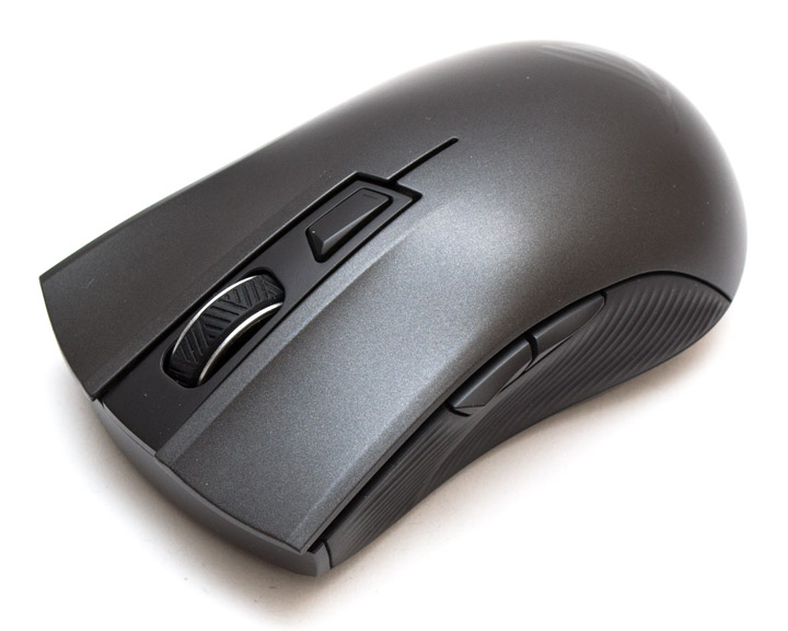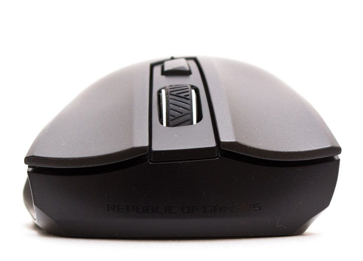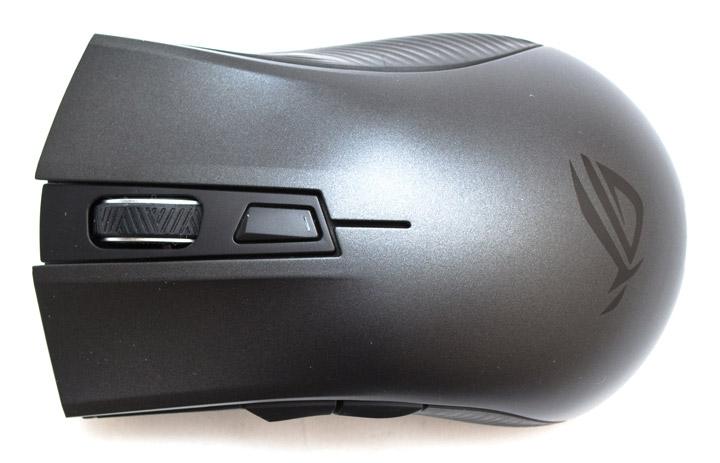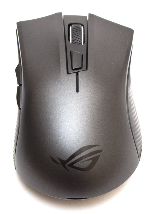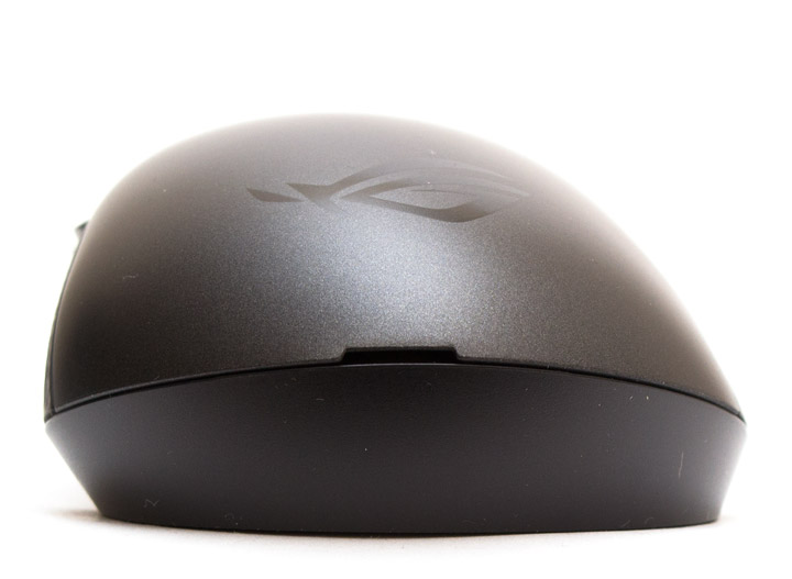 ASUS ROG Strix Carry — это мышь небольшого размера с эргономикой корпуса, рассчитанной под использование правой рукой. Верхняя панель сделана из гладкого серого пластика, с небольшим отливом. Панели двух основных клавиш цельные, нажимаются четко, обладают коротким ходом и приглушенным звуком щелчка. На матовой вставке между ними находится колесо прокрутки и трапециевидная кнопка, отвечающая за переключение разрешения и профилей (в сочетании с другими клавишами). В задней части кнопки встроен индикатор уровня заряда и соединения. Средняя клавиша чуть туже среднего и нажимается с глухим звуком срабатывания. Дополнительная кнопка легкая, но тоже не особо звонкая.