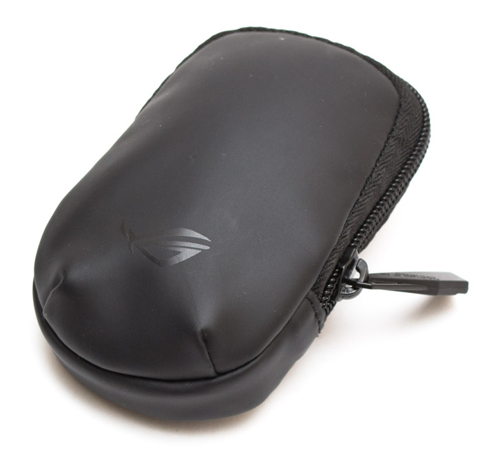 Поскольку продукт не имеет еще утвержденного образца упаковки, к нам его прислали в родном чехле для переноски. Он сделан из мягкой кожи с такой же мягкой обивкой внутри и застегивается на молнию. Вес составляет 24 грамма. Из декоративных элементов оформления отмечу тисненый логотип ROG и «брендированный» язычок замка.