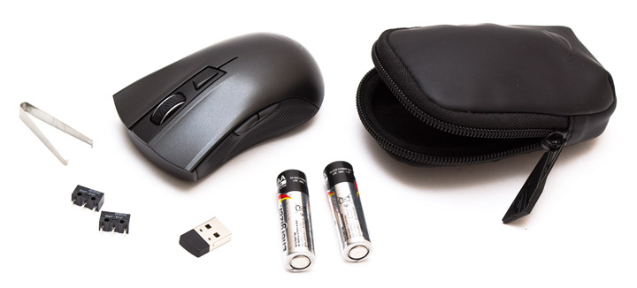 Из того, что вероятно будет в комплекте с мышью, мы обнаружили чехол, USB-передатчик, два запасных переключателя основных клавиш, пинцет для их демонтажа и две АА-батарейки Energizer. Скорее всего, в розничном варианте здесь будет еще стандартный набор из инструкции и листов с информацией о гарантии.