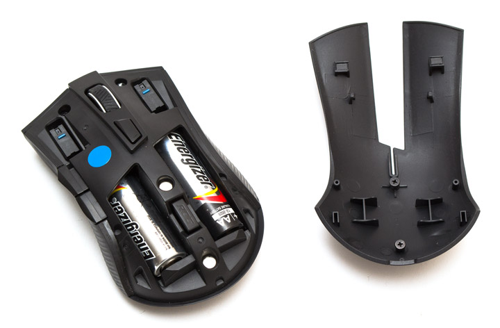 Верхняя панель держится на паре магнитов и полностью снимается, открывая доступ внутрь. Из-за неплотного крепления она может поскрипывать при нажатии. Под крышкой находится два отсека для батарей типоразмера АА, между которыми расположен кармашек для приемника, причем вставить его можно только одной стороной, иначе крышка не закроется. Кстати, использовать мышь с одной батареей тоже не получится, поскольку соединяются они последовательно.