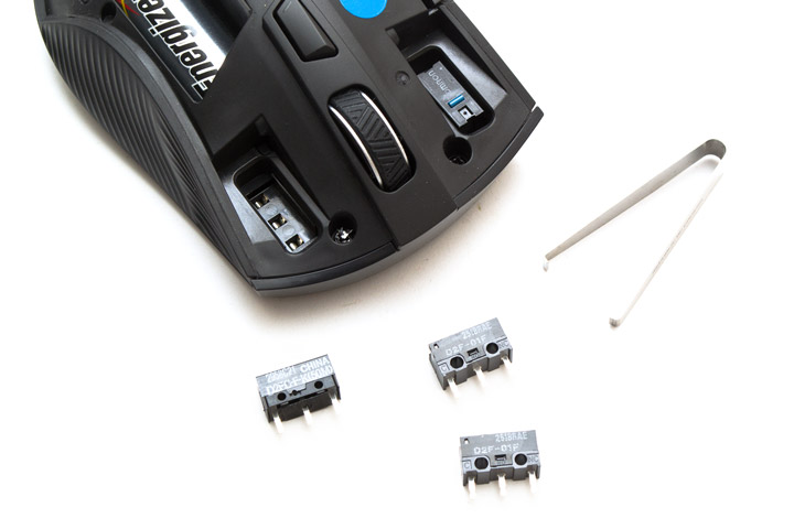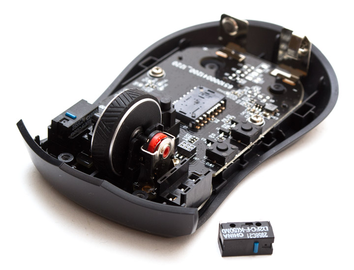 Уникальная «фишка» данной мыши — съемные переключатели основных клавиш, что позволяет не только быстро и без паяльника заменить изношенные механизмы, но и оперативно подобрать тот тип переключателей, который нравятся по тактильным ощущениям. По умолчанию сюда установлены китайские Omron D2FC-F-K(50M) с синими отбойниками, их можно поменять на запасные чуть более тугие и тихие японские Omron D2F-01F с отбойниками серого цвета.