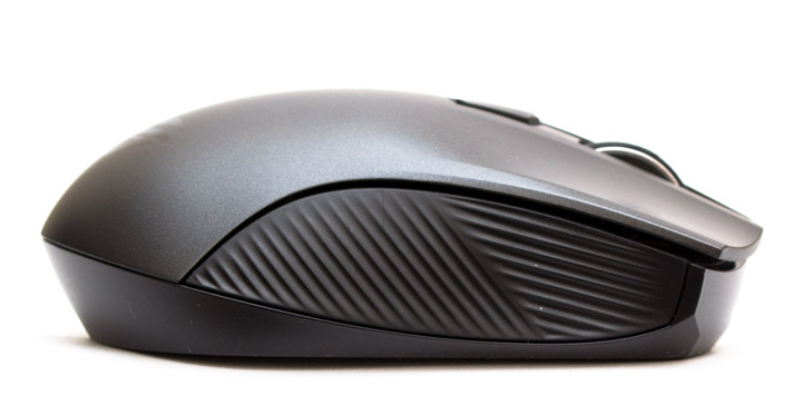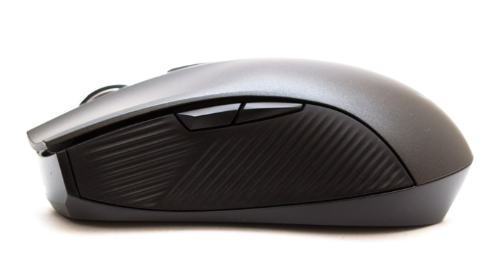 На левой боковине мыши есть две маленькие, треугольные в профиль дополнительные клавиши. Рельеф для улучшения сцепления с большим пальцем сделан из пластика с горизонтальными и диагональными полосками.
