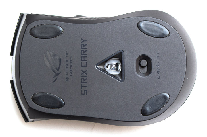 На основании мыши по углам приклеены четыре маленькие овальные тефлоновые ножки. Окошко оптического сенсора вставлено в треугольную рамку. Ниже нее находится ползунок переключателя, который можно перетянуть в одну из трех позиций — 2,4 ГГц, Bluetooth или выключено.