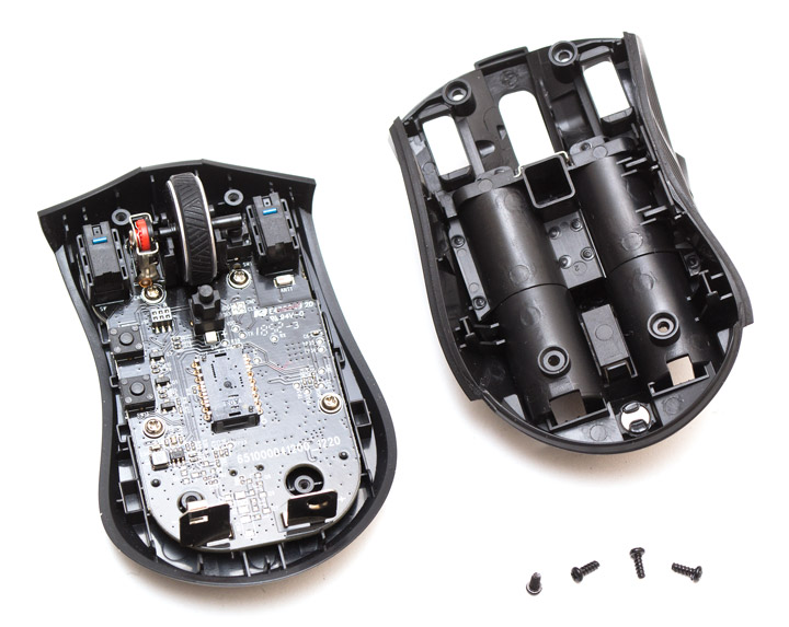 Поскольку информации о начинке мыши на официальном сайте в момент тестирования мы не обнаружили, равно как и ее страницы, было решено заглянуть внутрь. Корпус удерживается в сборе четырьмя винтами. Два находятся возле переключателей основных кнопок спереди, еще два спрятаны под наклейкой в батарейном отсеке сзади.