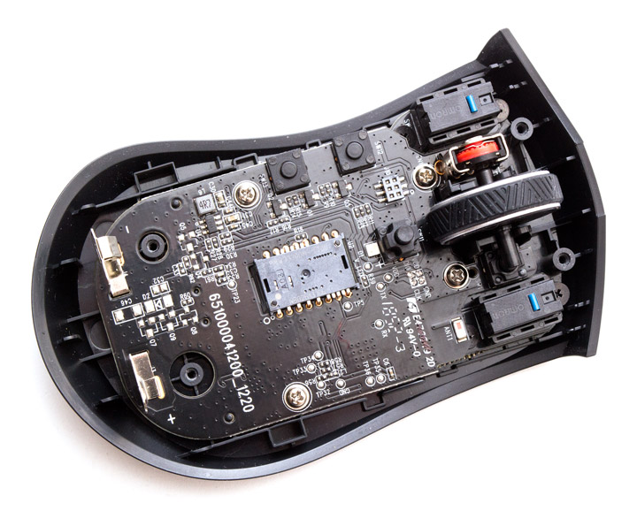 Энкодер колеса прокрутки сделан фирмой Kailh (но предпологалось увидеть тут Alps). Все дополнительные кнопки сделаны на базе квадратных микропереключателей, которые имеют невысокий ресурс наработки на отказ.