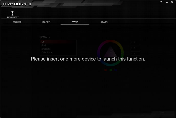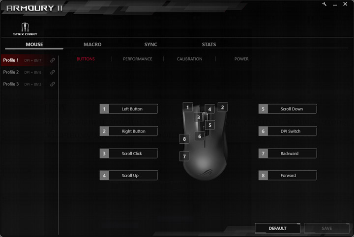 В драйвере есть функция синхронизация подсветки с другими устройствами ASUS. Но поскольку других под рукой не нашлось, вкладка осталась недоступна. Да и подсветки на данной мыши, в общем-то, и нет…