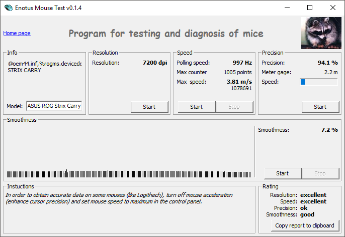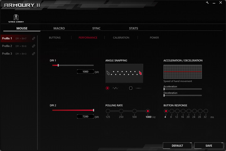 Настройки сенсора выглядят богато. Тут есть два уровня разрешения, каждый из которых можно выставить в диапазоне от 50 до 7200 cpi с шагом в 50 cpi. Раздельной регулировки по осям X и Y нет. Можно включить или отключить угловую привязку, задать уровни акселерации и деакселерации курсора, выставить частоту опроса на 125, 250, 500 или 1000 Гц. Кроме того, настраивается время реакции клавиш в пределах от 4 до 32 мс с шагом в 4 мс. Его можно поставить в минимальное значение, при котором не происходит двойного нажатия в следствие эффекта «дребезга» контактов при замыкании.