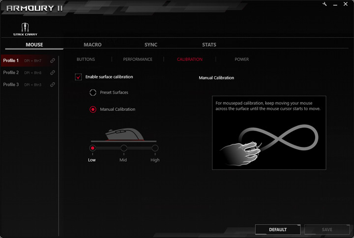 Есть и калибровка поверхности, а точнее — высоты отрыва сенсора. Если ее включить, то в первом варианте предлагается выбрать одну из предустановленных настроек для фирменных ковриков ASUS, либо типа поверхности — металл, пластик, ткань и стекло. Во втором вариант высота ставится вручную на низкое, среднее и высокое значение, после чего нужно пошевелить мышью до тех пор, пока не начнет двигаться курсор.