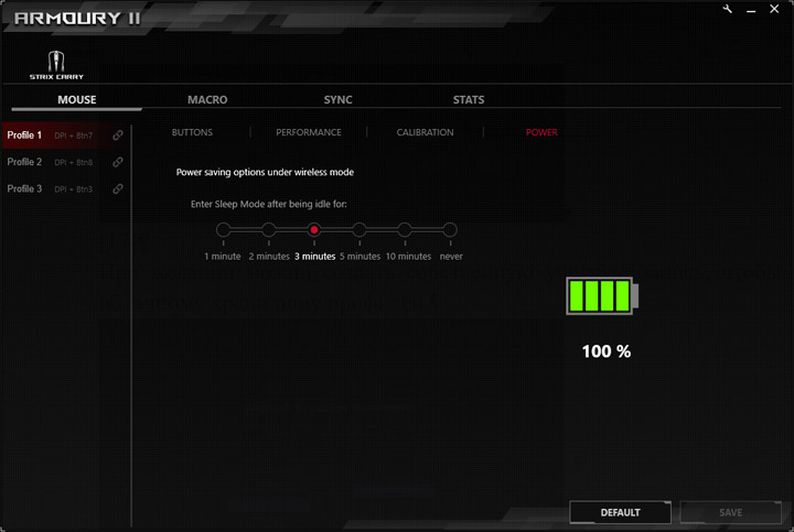 Мышь ASUS ROG Strix Carry настраивается с помощью фирменного универсального драйвера ROG Armoury II (в нашем случае — версии 3.00.22, более новая устанавливаться наотрез отказалась), который требуется загрузить с официального сайта и установить. После установки программа будет постоянно активной, если другое не указано в ее настройках. Доступна автоматическая и принудительная проверка обновлений. Текущая версия прошивки мыши — 1.05.00. Прошивка USB-передатчика — 1.07.09. На выбор доступно 12 языков интерфейса.