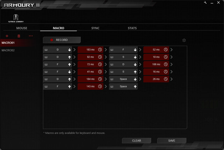 В макроредакторе можно создавать неограниченное количество макросов, присваивать им названия, удалять, изменять, импортировать и экспортировать. Для записи доступны клавиатурные команды и основные функции мыши (не считая прокрутки). Задержки можно записывать как есть, с фиксированным временем или без задержки. Воспроизведение можно назначить разово, на определенный отрезок времени, или до отпускания командной клавиши.