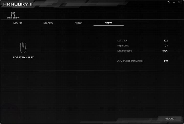 Во вкладке статистики после нажатия кнопки Record производится регистрация количества нажатий на левую и правую кнопки и подсчет пройденной дистанции. Правда есть ощущение, что учет там ведется вовсе не в сантиметрах, а в миллиметрах, судя по огромным цифрам, получающимся при небольшом смещении курсора. По завершению записи заполнится и строка APM — количества нажатий в минуту. Вероятно, что эта информация касается только левой кнопки.