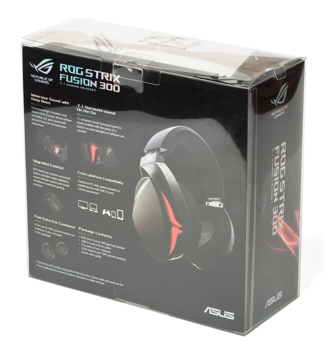 ASUS ROG Strix Fusion 300 поставляется в коробке из прозрачного пластика. На передней панели виднеется левая чашка и нарисован красивый логотип серии ROG. На задней части изобразили гарнитуру и кратко описали её достоинства.