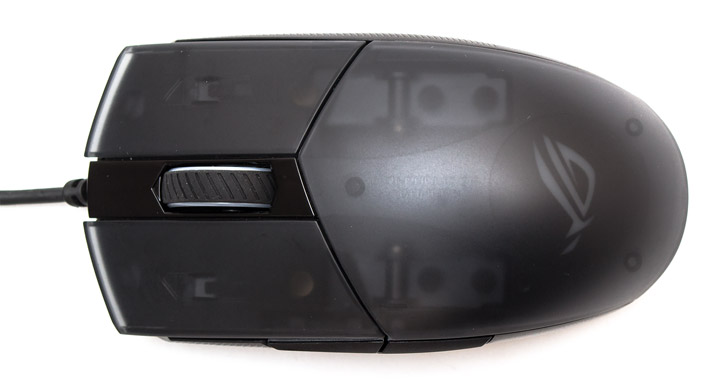 В отличие от предшественников, верхняя панель Strix Impact II сделана из полупрозрачного дымчатого пластика, через который видны пружинные механизмы основных клавиш. Решение не то, чтобы очень практичное, зато оригинальное. Подобный «карамельный» дизайн был очень популярным в конце 90-х после выхода компьютеров iMac. Покрытие гладкое на ощупь, легко собирает загрязнение и так же легко очищается от него. Панели ЛКМ и ПКМ отдельные, благодаря пружинам они не только быстрее возвращаются в исходную позицию после нажатия, но и лучше прижимаются к переключателям, сводя к минимуму запас свободного хода. От небольшого люфта это, конечно же, их не спасает. По усилию нажатия обе кнопки средние, четкие и относительно тихие. Накликивать на них можно быстро, хотя тактильная отдача не идеальная. Между клавишами есть глянцевая вставка, обрамляющая колесо прокрутки. Переключатель под ним стоит традиционно тугой, с приглушенным звуком активации. Зато само колесо не шатается и крепко сидит на своем месте.