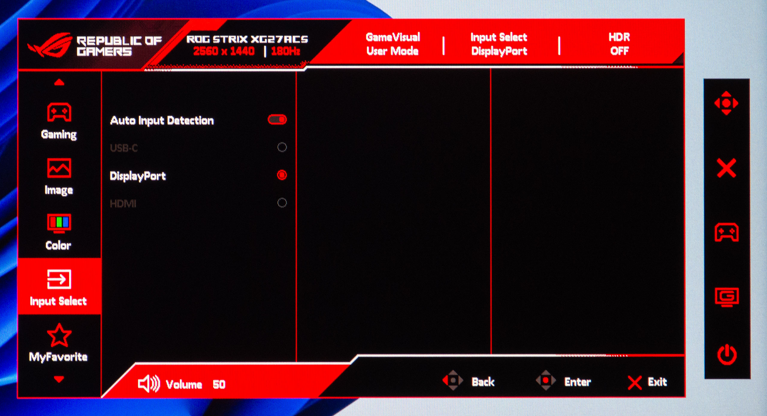 Меню вызывается с помощью пятипозиционного джойстика, который расположен на задней стороне монитора справа от пользователя. Дизайн меню имеет современный вид и выполнен в красном цвете, что соответствует серии ROG. Сверху видим название устройства, его разрешение и текущую частоту обновления, профиль монитора, порт подключения к видеокарте и функционирование технологии HDR. Слева размещены разделы меню, первый из которых — Gaming. В нем находятся настройки разгона матрицы, управления адаптивной синхронизации и ELMB. Также там имеется подраздел с игровой функциональностью вроде счетчика fps, перекрестия или снайперского прицела, таймера и тому подобное.