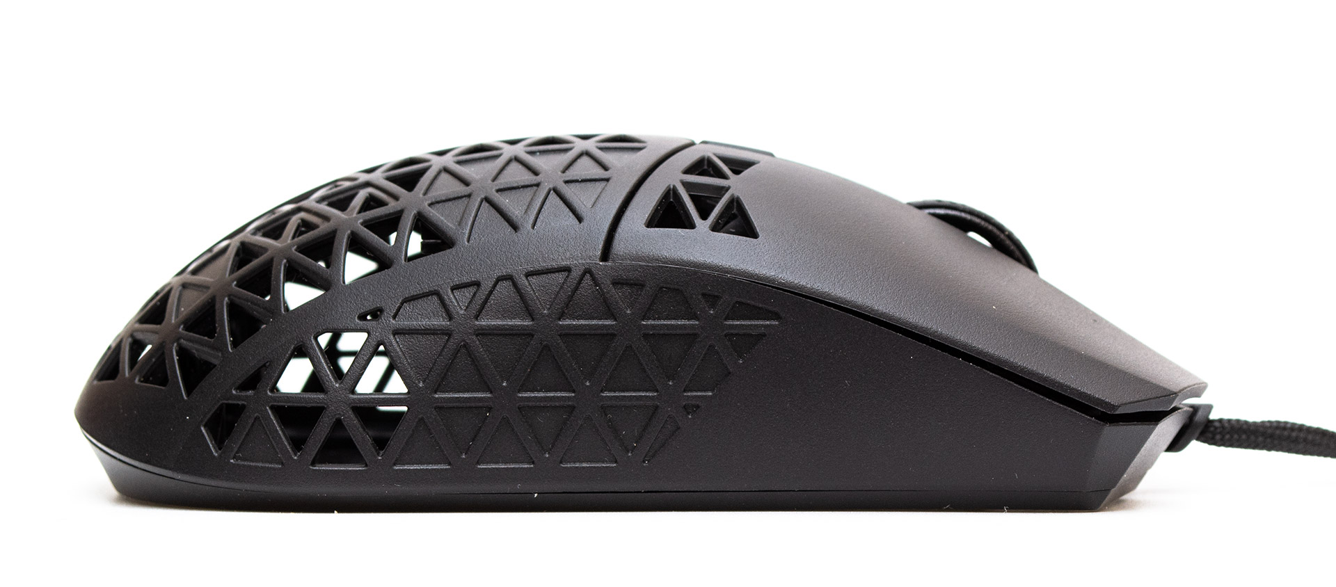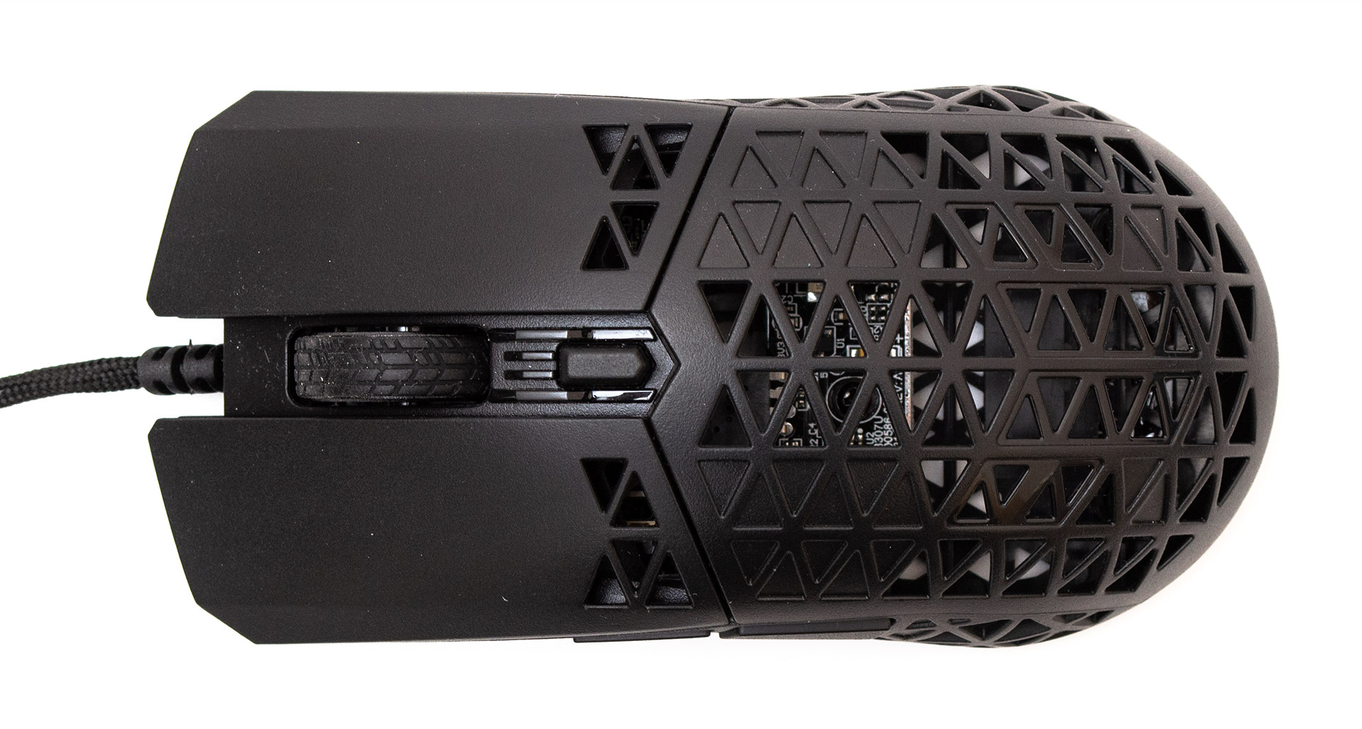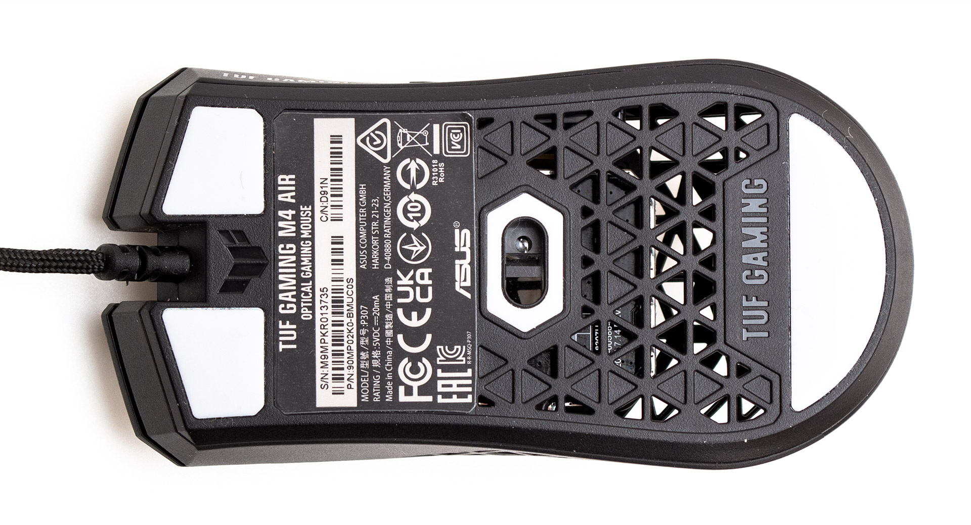 По форме ASUS TUF Gaming M4 Air представляет собой классическую симметрию. Большая часть её спинки и, частично, клавиш, покрыта отверстиями треугольной формы. Поверхность мыши черного цвета, матовая, цепкая и приятная на ощупь. Она устойчива к загрязнениям. Более того, компания декларирует еще и антибактериальные свойства этого покрытия, достигаемого за счет наличия в нём «позитивно заряженных ионов серебра». Сам корпус получился очень легким и крепким. Панели основных клавиш отдельные, без люфтов и дребезга. ЛКМ и ПКМ срабатывают с усилием и громкостью ниже среднего. Нажатия четкие и тактильно информативные. Переключатель разрешения активируется с усилием чуть больше среднего и характерным пластиковым призвуком, хорошо отличимым на фоне звучания остальных кнопок. Средняя кнопка нажимается чуть туже среднего и довольно тихо.