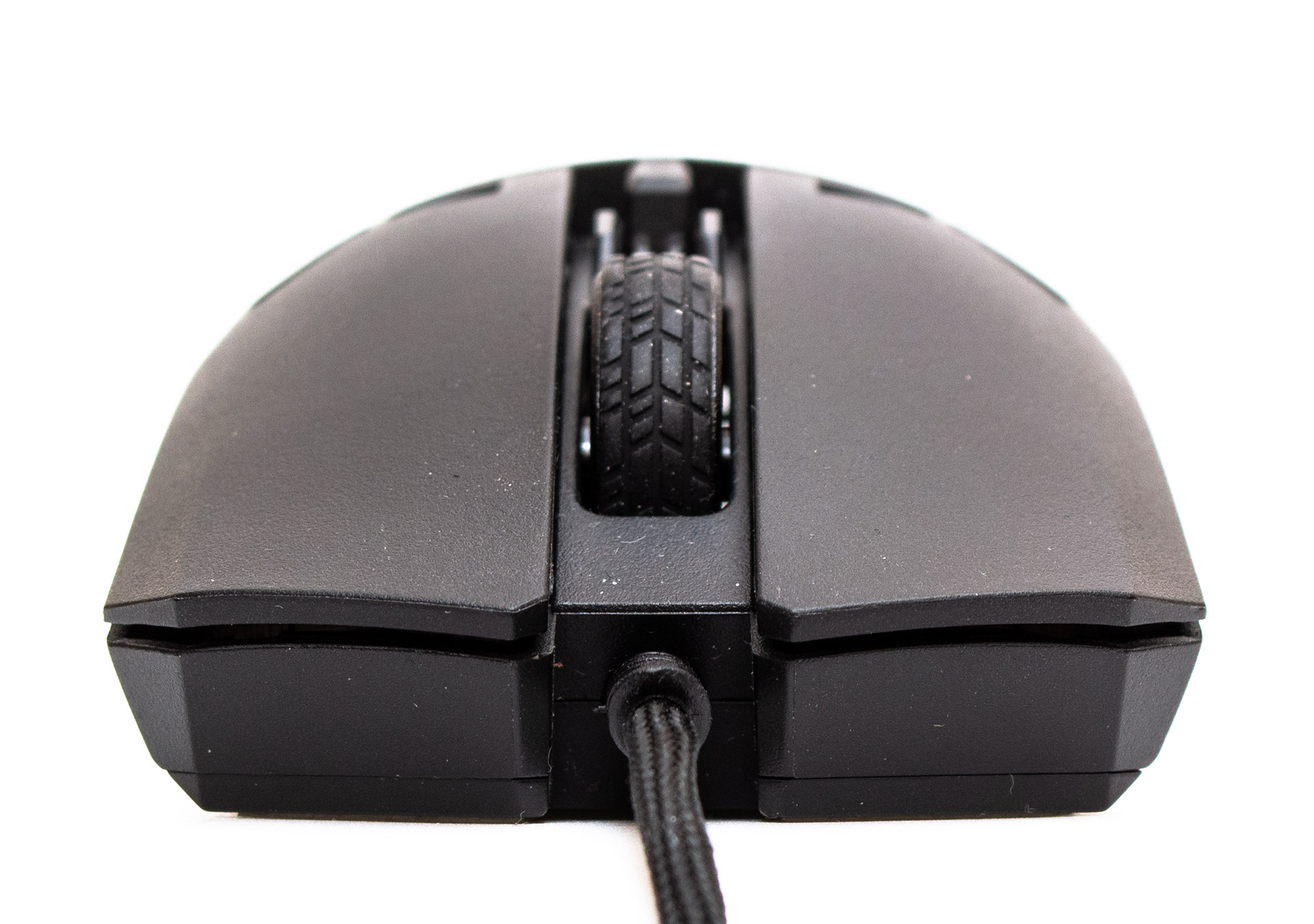 Колесо прокрутки прорезинено и имеет фактуру в виде автомобильной покрышки. Вращается очень тихо по направлению вниз и с небольшим потрескиванием при прокрутке вверх. Все позиции фиксации четко отрабатываются тактильной отдачей. Люфт отсутствует. Кабель заходит в корпус в углублении по центру между клавишами на приличной высоте. От перегибов его защищает сантиметровая резиновая вставка.