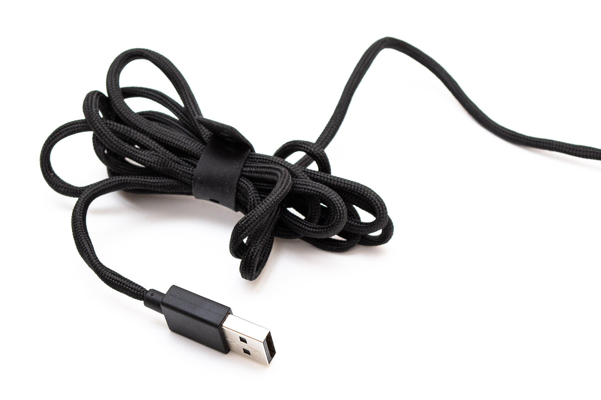 Мягкий и очень гибкий кабель имеет длину 2 метра и оплетку типа «паракорд». Он никак не мешает движениям мыши и его можно свободно использовать без держателя. Тем не менее оплетка имеет тенденцию скользить и перекручиваться вокруг шнура. Ферритового фильтра нет, но есть резиновая стяжка, позволяющая регулировать необходимую длину провода.