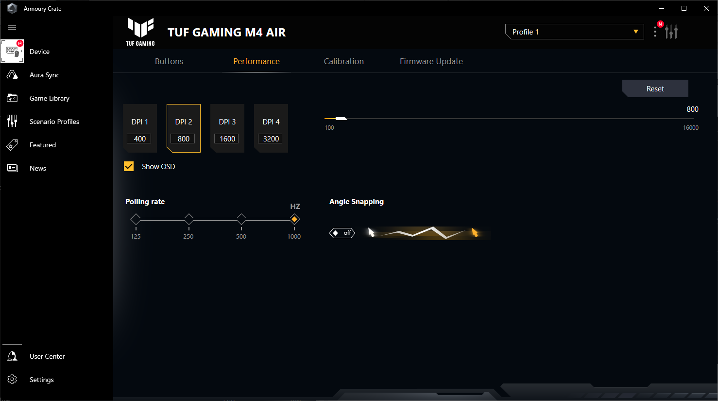 Без установки программного обеспечения на ASUS TUF Gaming M4 Air можно переключать четыре предустановленных уровня разрешения в 400, 800, 1600 и 3200 cpi с помощью соответствующей кнопки. Переключение трех бортовых профилей памяти осуществляется путем зажатия переключателя разрешения вместе со средней (3 профиль), передней (2 профиль) или задней (1 профиль) боковой кнопками мыши.