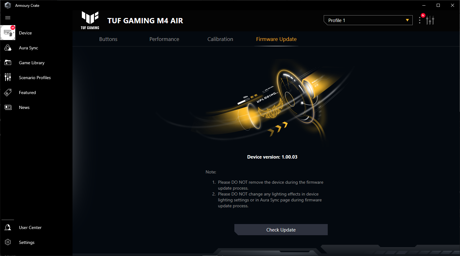 Мышь M4 Air полностью оправдывает свое название, поскольку ощущается воздушной и невесомой, когда первый раз берешь её в руки. Это сочетается с необычной прочностью верхней крышки, которая не издает никаких скрипов при нажатии. Нижняя панель, конечно, слегка прогибается, но вряд ли кто-то будет заниматься этим целенаправленно. Покрытие отличается устойчивостью к загрязнению. Кроме того, если оно действительно обладает антибактериальными свойствами, как заявляет производитель, то это вдвойне хорошо. Корпус мыши почти не имеет ощутимой инерции из-за малого веса. По той же причине, ножки оказывают крайне малое сопротивление скольжению. Кабель тоже никак не мешает быстрым движениям устройства, которое субъективно воспринимается не только как невесомое, но и как беспроводное. Как упоминалось ранее, баланс веса мыши смещен вперед, но это никак не сказывается на его удобстве использования. По размеру корпус мыши подойдет под среднюю или крупную руку и любой тип хвата. Все кнопки и колесо прокрутки не вызывают вопросов и работают четко. Особых изменений в программном обеспечении Armoury Crate замечено не было. А три бортовых профиля памяти позволяют обойтись без ПО в подавляющем большинстве случаев.