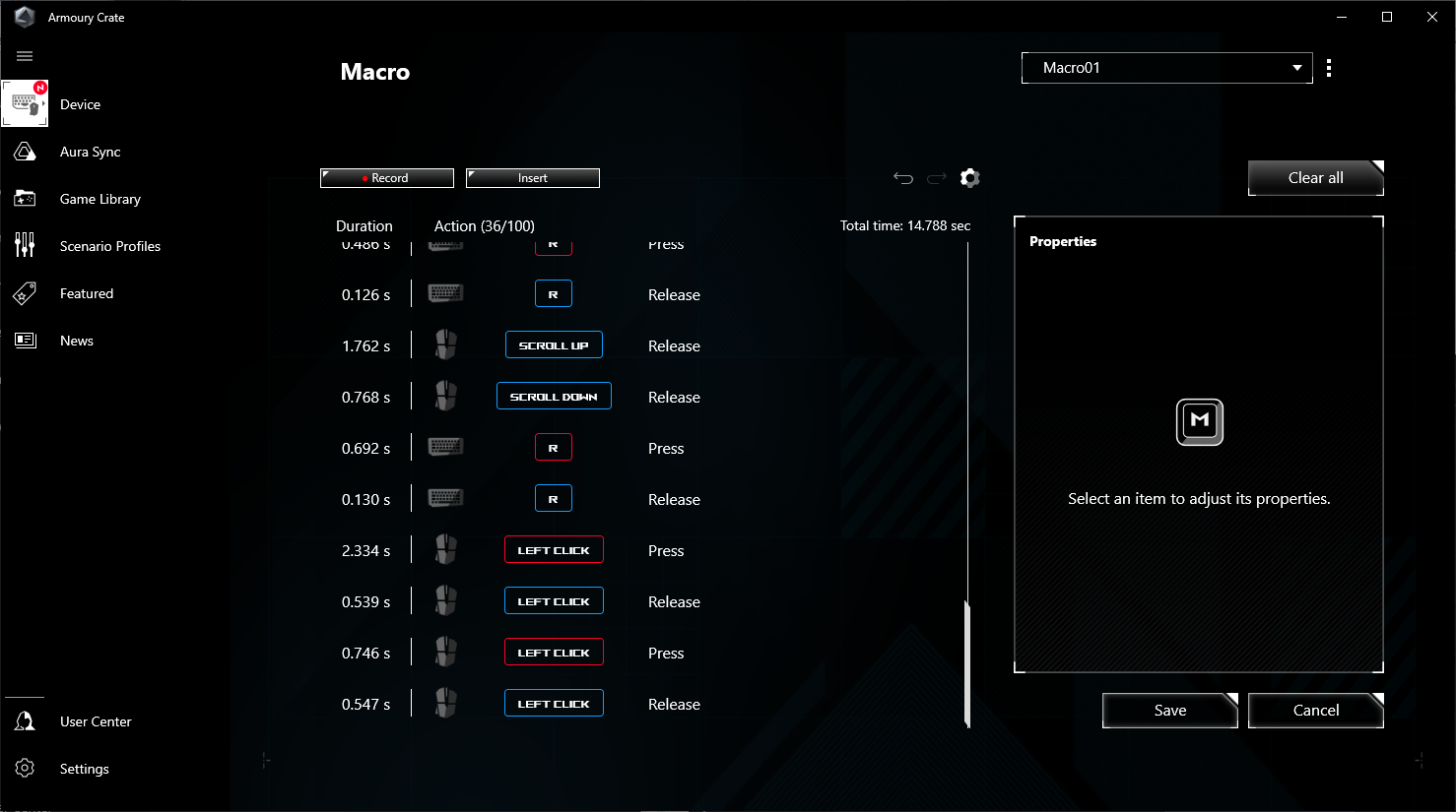 Редактор макросов позволяет записывать команды с мыши и клавиатуры, в том числе и направления колеса прокрутки. Траектория движения курсора не фиксируется. В одну макрокоманду помещается до 100 команд, каждая из которых состоит из времени задержки, связанной с нажатием и отпусканием клавиши. Все задержки записи и воспроизведения, последовательность и содержание команд можно легко отредактировать по окончанию записи.