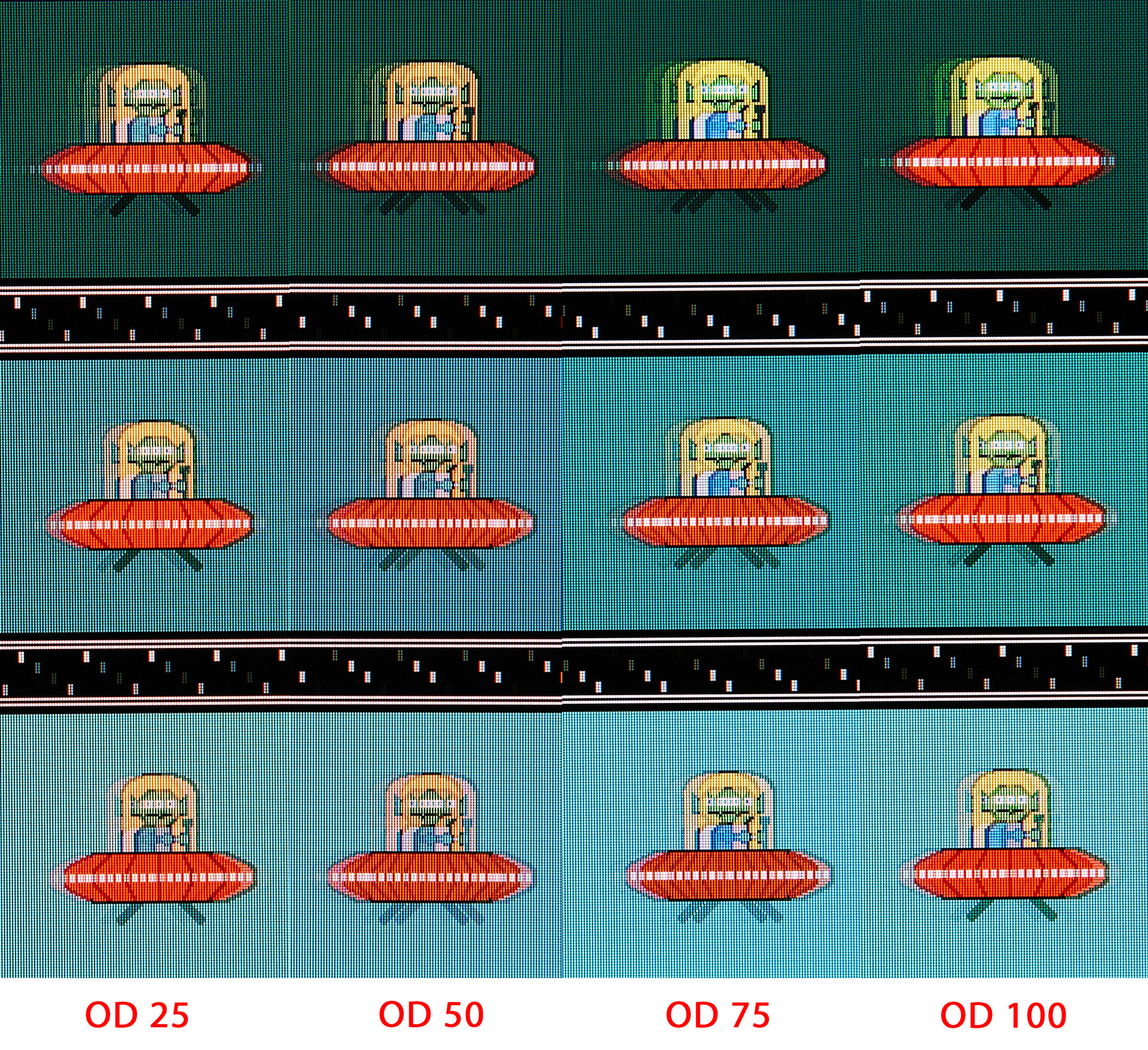Протестировав промежуточные значения стало ясно, что этот ползунок не влияет на качество картинки. При максимальном значении в 100 полностью отсутствуют артефакты на любых цветовых переходах. То есть про настройку OD вы можете забыть.