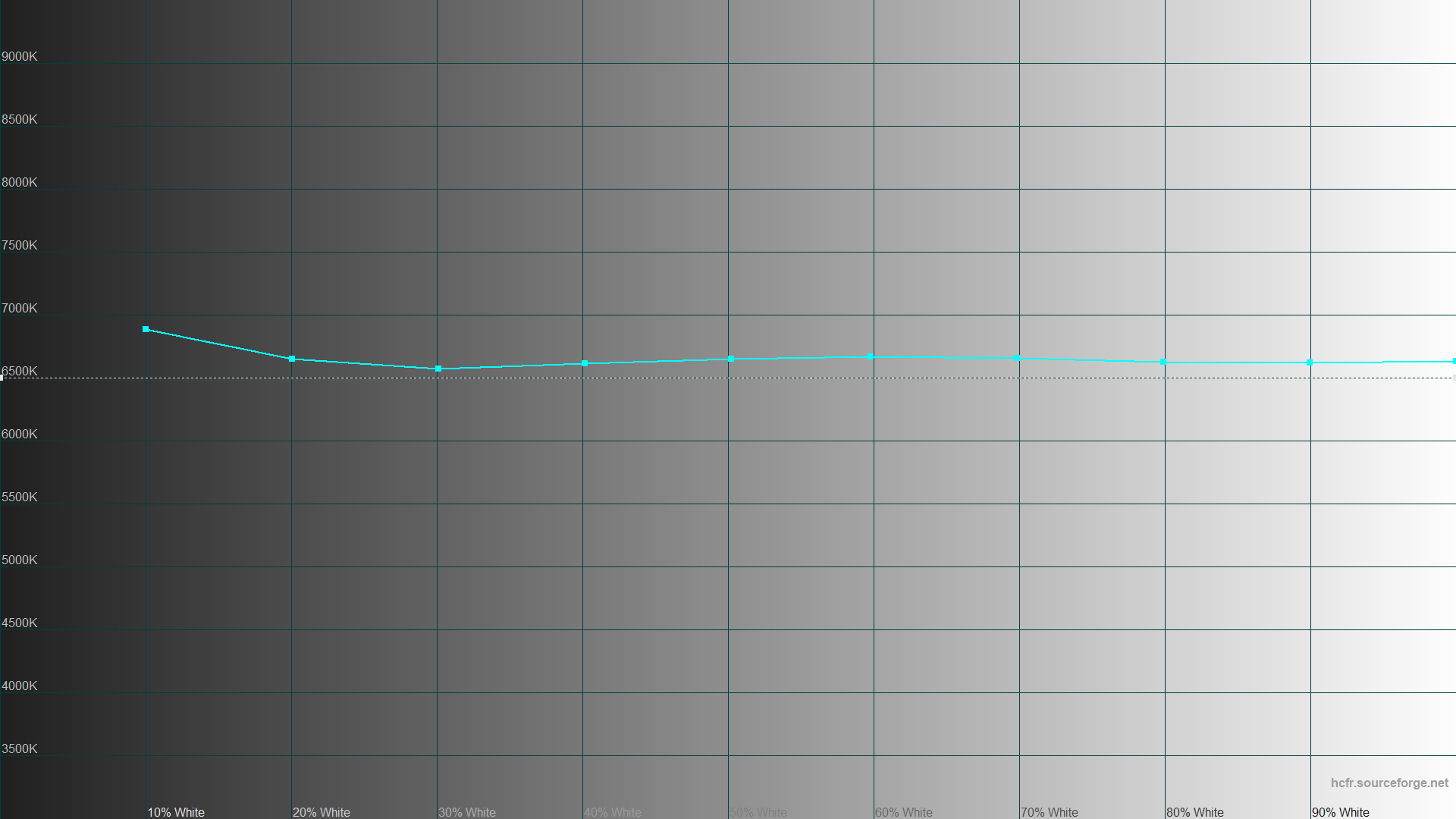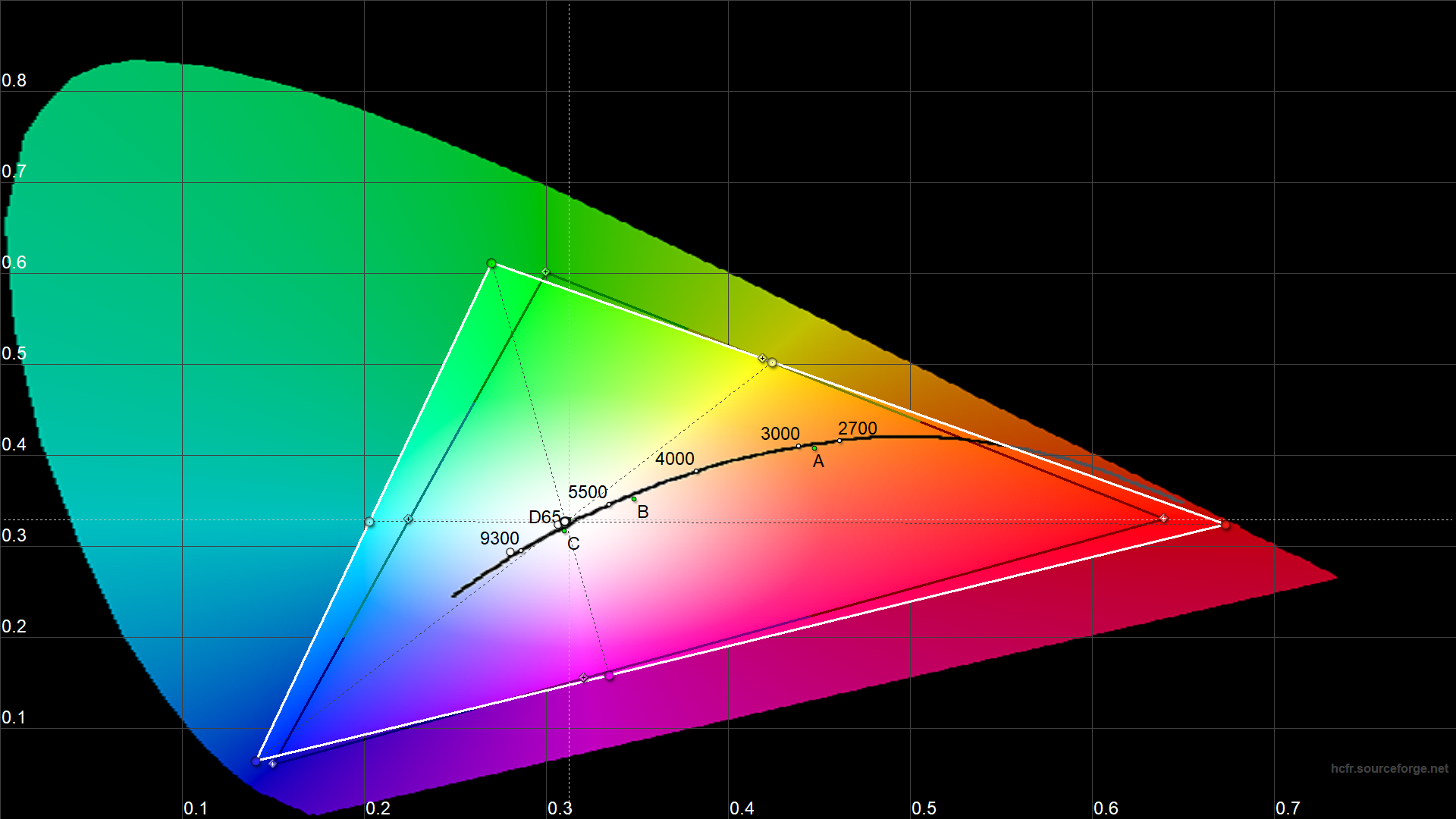 Заводской профиль User, хоть и явно выигрывает в сравнении с другими пресетами, но всё же не показывает идеальных значений точки белого. Максимальное отклонение составило 5,48 единиц, а среднее значение — 2,08 при рекомендованных значениях меньше 3 и 1 соответственно. Не лучшие показатели, но и далеко не худшие.