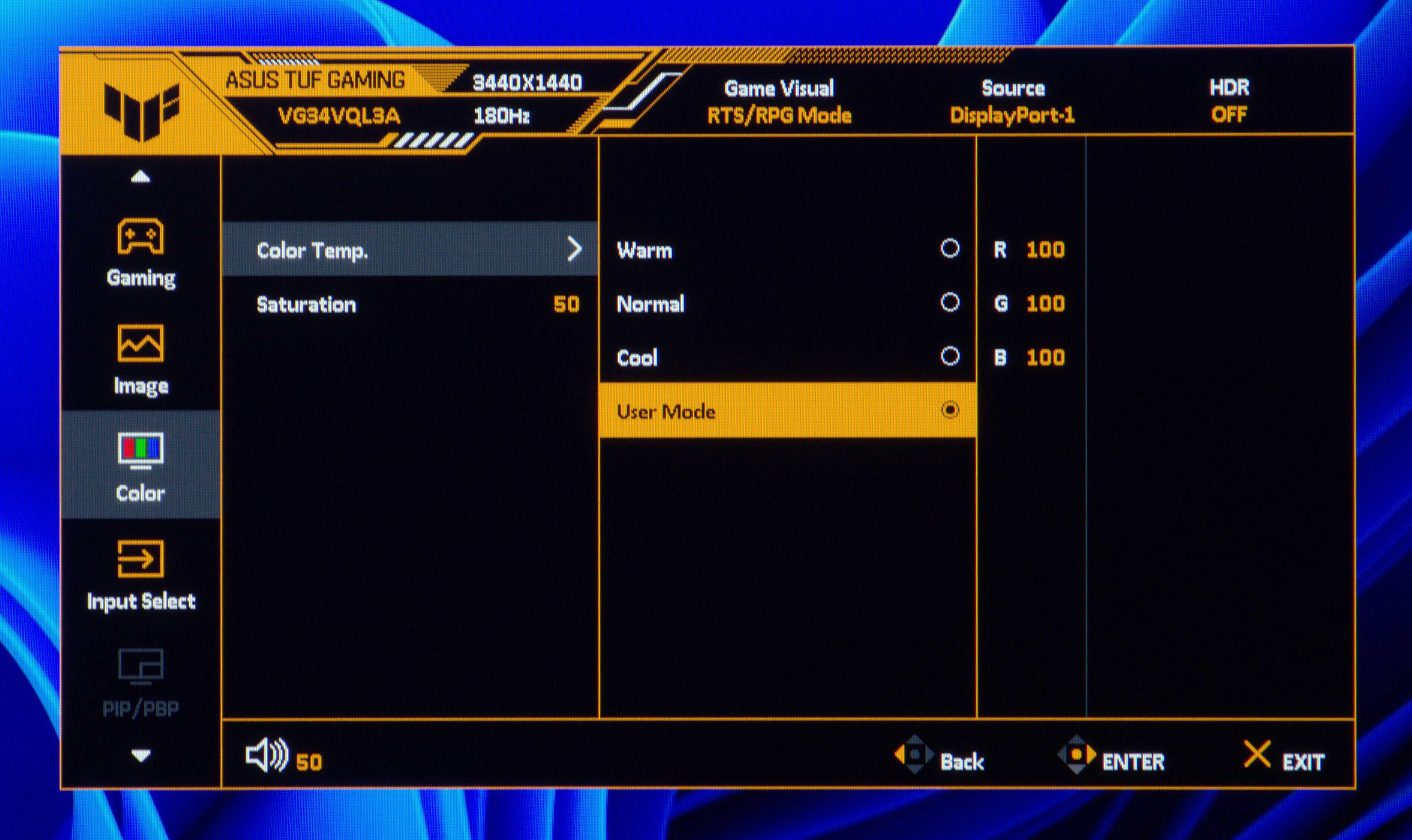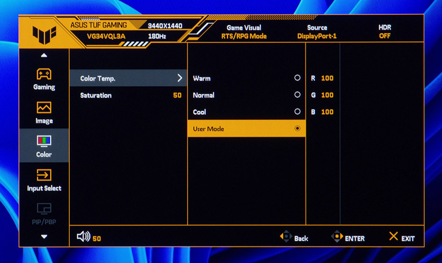 Как уже указывалось, картинка у TUF Gaming VG34VQL3A холодная. Это обусловлено заниженным красным цветом, что видно по референсным линиям.