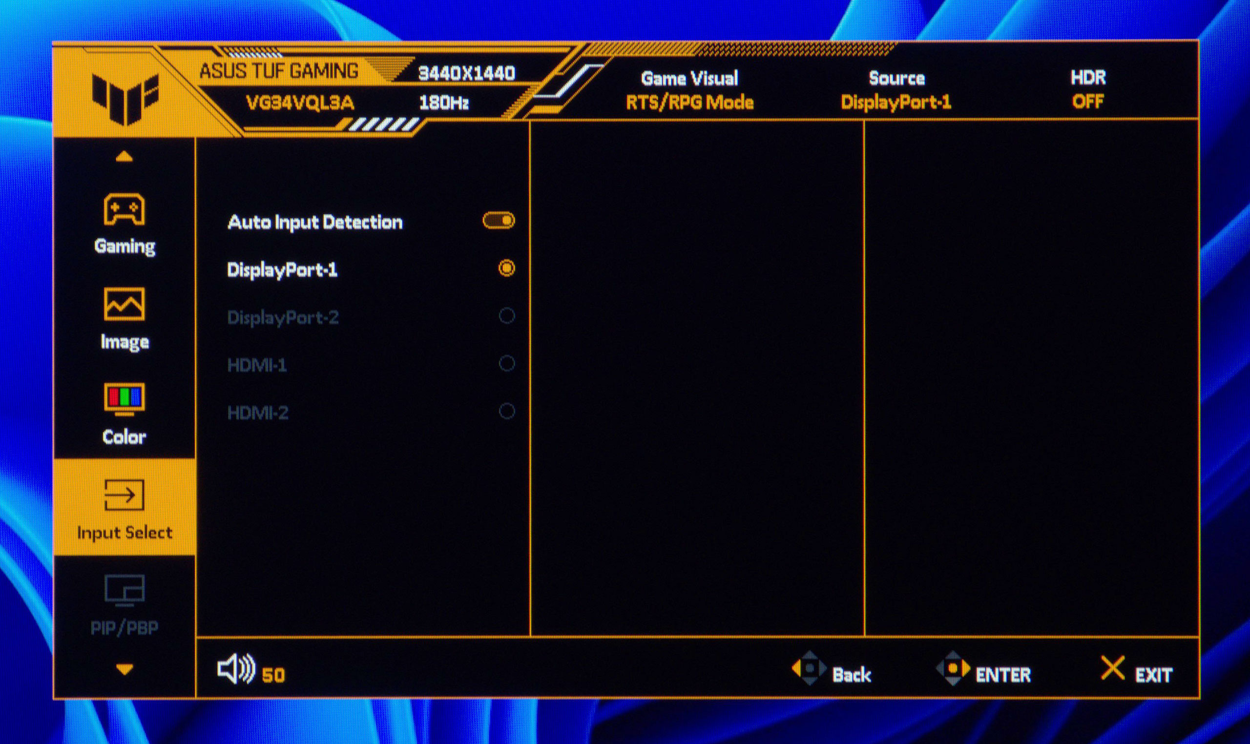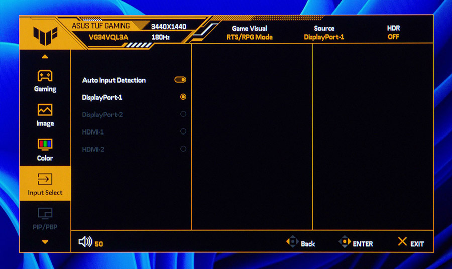 Там же, за индикатором, находятся органы управления TUF Gaming VG34VQL3A: слева — кнопка быстрого вызова фирменного приложения, по центру — пятипозиционный джойстик, а справа — кнопка включения устройства. И это правильное решение, потому что тянуться за кнопками в правую сторону монитора, где они обычно находятся, при такой диагонали будет не очень удобно.