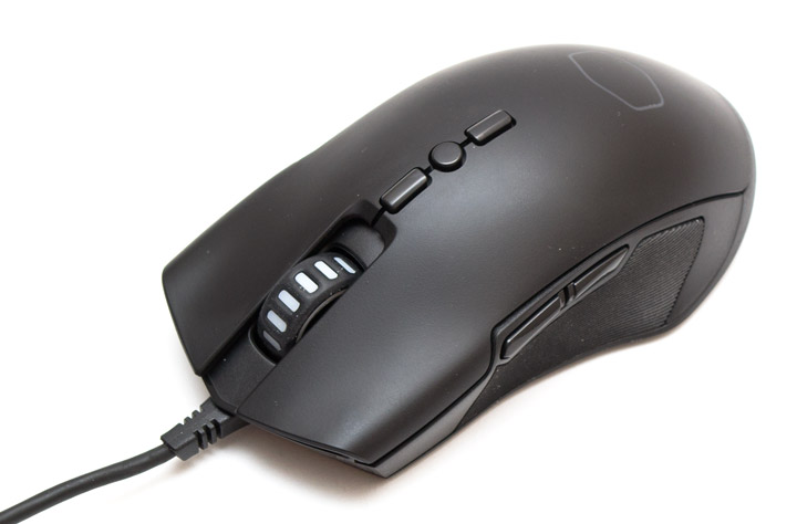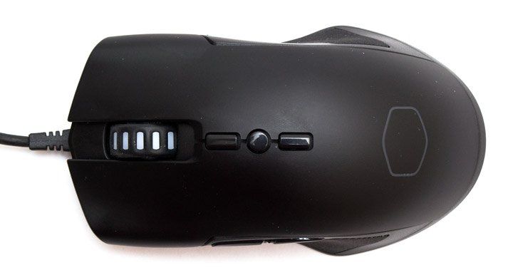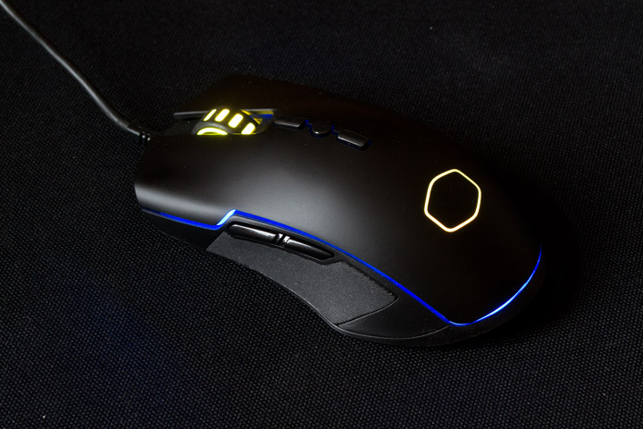 На корме мыши в верхней части есть новый логотип Cooler Master, в виде скругленного шестиугольника, а между глянцевой нижней и матовой верхней панелью проходит зазор светодиодной ленты.