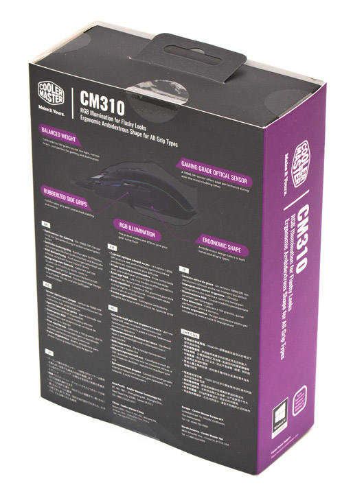 Упаковка мыши выглядит привлекательно и не особо броско. Основная часть информации подается на черном фоне, боковины раскрашены в фирменный фиолетовый цвет. Фотографии изделия и перечисление его достоинств на многих языках тут есть, а вот технические характеристики дописать сюда забыли.