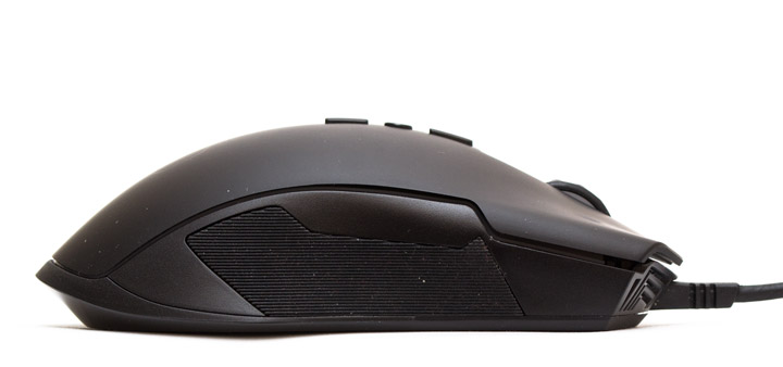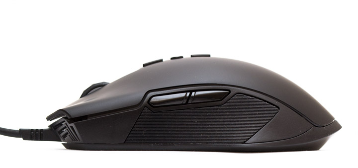 Левая боковина прорезинена в месте контакта с большим пальцем, причем резиновое покрытие сделано в виде горизонтальных микро-каналов. Не знаю, насколько это улучшает сцепление, но грязь туда забивается довольно легко. Хорошо, что и очистка производится тоже просто. Две боковые кнопки глянцевые, и слегка выступают в бок, что позволяет нащупывать их без проблем. Нажимаются обе клавиши легко и тихо, люфта и запаса свободного ходу у них нет. Между верхней панелью и боковиной по всей длине корпуса мыши есть зазор, куда встроена светодиодная лента с множеством активных элементов.