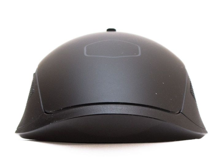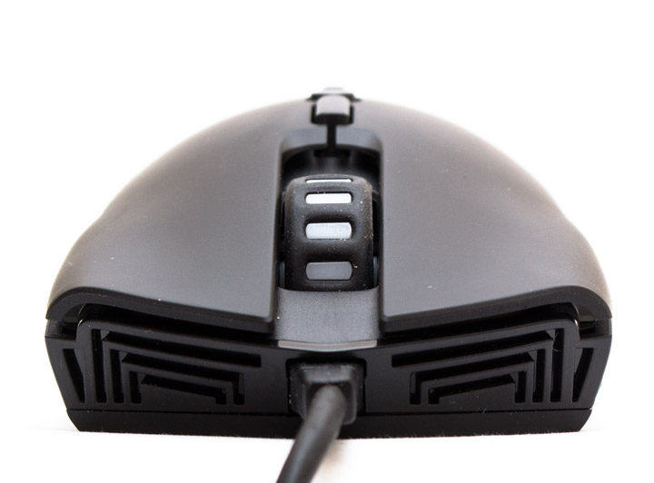 Кабель заходит в корпус мыши ровно посередине, с небольшим запасом по высоте и мощной защитой от перегиба провода. Передняя панель имеет декоративный рельеф. Колесо прокрутки прорезиненное, с отверстиями по бокам и сверху, через которые видно подсветку. Вращается легко и практически бесшумно, с хорошо ощутимыми позициями фиксации. Для нажатия на него требуется среднее усилие, звук активации незначительно звонче, чем у основных кнопок.