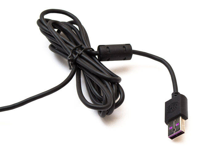 Сигнальный USB-кабель имеет длину в 1,8 метра, и обходится без оплетки. Степень жесткости провода чуть выше среднего, он склонен распрямляться самостоятельно. Недалеко от USB-разъема на шнур одето ферритовое кольцо.