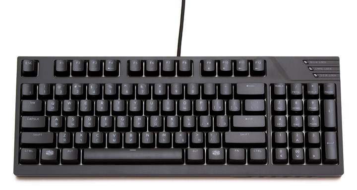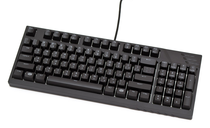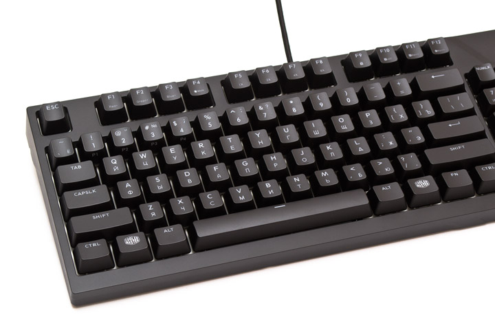 Внешность Cooler Master MasterKeys Pro M RGB предельно строгая, без дизайнерских изысков. Корпус выполнен из матовой черной пластмассы, которая кажется полностью ровной. И лишь присмотревшись внимательнее, можно заметить на ней фигурные штампованные углубления. Странно и то, что хотя на видимой части корпуса нет логотипов, обе привычные кнопки Win заменены на клавиши с эмблемой Cooler Master. Впрочем, свою изначальную функцию они сохранили без изменений.