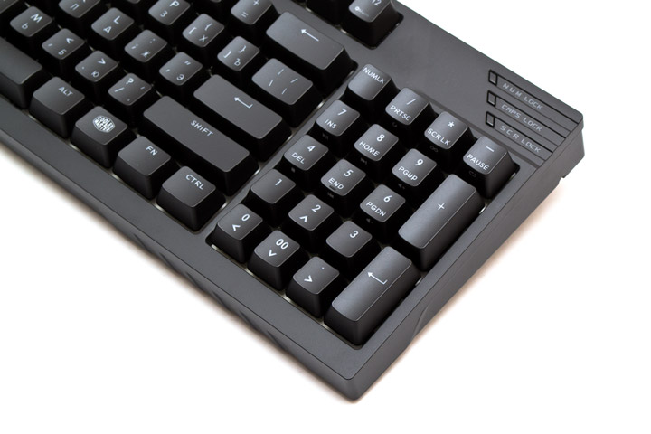 Стрелочки и редакторские клавиши в данной клавиатуре физически отсутствуют. Их функции назначены кнопкам цифрового блока. Работает это следующим образом: по умолчанию (когда индикатор Num Lock не светится) символы «0», «00», «2» и «.» работают вместо стрелок, кнопки «/», «*», «-» обрабатываются как PrtSC, ScrLK и Pause, а цифры 7, 8, 9, 4, 5, 6 активируют команды Ins, Home, PgUP, Del, End и PgDN соответственно. Если нажать NumLK, засветится соответствующий индикатор и клавиши цифрового блока заработают в привычном режиме, воспроизводя цифры при нажатии. Звучит сложно только поначалу, на практике все становится привычным и интуитивно понятным уже через пару часов использования, тем более что все кнопки подписаны. В верхнем правом углу есть диагональный ряд из трех подписанных индикаторов — Num Lock, Caps Lock, Scroll Lock. Они светятся белым цветом при активации своих функций.