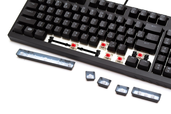 В клавиатуре установлены легкие линейные переключатели Cherry MX Red в прозрачном корпусе. Сила активации — 45 грамм, с 2 мм до срабатывания, и полным ходом в 4 мм Диоды RGB-подсветки распаяны непосредственно на печатной плате, на переключателе нет даже фокусирующей линзы. Стабилизаторы внутренние, потому все клавиши без труда снимаются для очистки. Стандартные колпачки выполнены из полупрозрачного ABS-пластика и окрашены черной краской снаружи. Альтернативно в продаже доступны версии этой клавиатуры с переключателями Cherry MX Blue, Brown и Silver, обладающие разным звучанием и другой тактильной отдачей. Все механизмы установлены в металлическую опорную пластину белого цвета.
